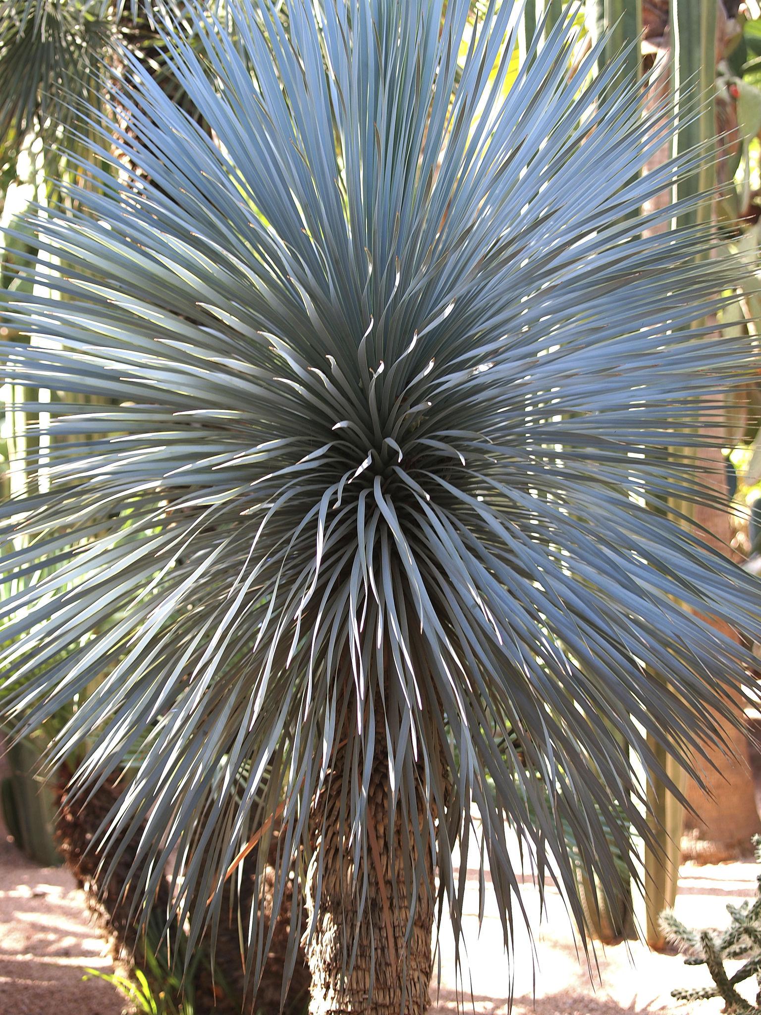 Yucca rostrata wyróżnia się niezwykle dekoracyjnym wyglądem. Tworzy gruby pień zakończony idealnie kulistą koroną liści.